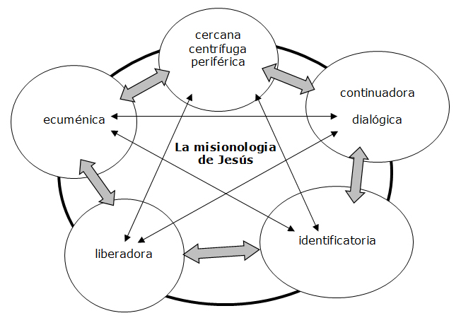 La motivación de Jesús para identificarse con aquellos que están enfermos, dolidos, afligidos, extenuados, maltratados por las circunstancias de la vida la cual pareciera no ser digna de ser vivida, se desprende de su compasión. Jesús se movía por compasión, pero no son las circunstancias ajenas las que determinan ese deseo de entrar en acción, para erradicar las causas de tales circunstancias, sino una virtud interna, cultivada por una espiritualidad a tono con el amor de Dios. Jesús se colocó las sandalias de sus congéneres para entender realmente sus vivencias y poder sentir sus vicisitudes cotidianas. Todas las características de la misionología de Jesús se conjugan e interrelacionan entre sí. Fue a sus aldeas, dialogó y enseñó, porque se identificaba con ellos; sanó y trajo nueva vida por su compasión y esta misma compasión, le llevó a invitar a otros para cooperar en la erradicación de los males que “despellejan” la vida humana. En su misionología cada virtud no solo tiene un efecto en cadena, sino que también se afectan mutua y orgánicamente. Lo graficamos de la siguiente manera:
