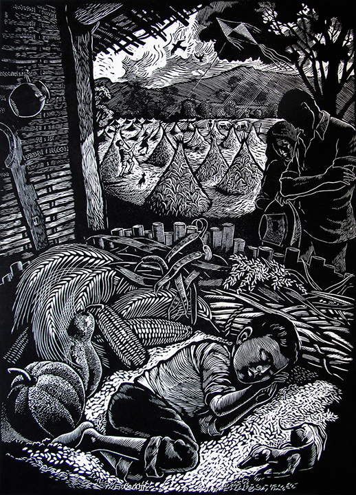 In el troje or the barn, my feet feel the corn. I step on the corn, sink and get lost in the corn. Jumping I make pirouettes and lie down and dream that I am the corn. A child of the corn: made of corn meal, color of a tortilla. I leave with my kite tied to a string of stars, the backbone of a giant animal. Above the moon is serene.