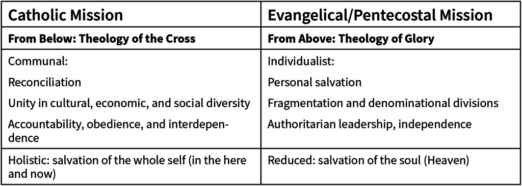 In contrast to this model, many non-Catholic missions arrived in Latin America from a position of power and wealth. Cases abound where the missionaries serving among the poor chose to live in housing separated from the people they served. The empty cross spoke of a God of Glory, distant and unmoved, who related to some groups in terms of doctrine while offering others economic prosperity. This model tended to import not only theologies from North America but also the liturgical, musical, and church organization styles from there. Sadly, the message’s contextualization was minimal.